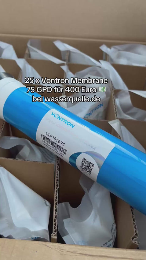 Vontron Membran für 10"x 2,5" Umkehrosmosefilter / Membranengehäuse mit einer Tagesleistung bei 75 gpd von 292,5 Liter, bei 50 gpd von 195 Liter, bei 100 gpd von 390 Liter und bei der 150 gpd von 585 Liter am Tag. Die Standardmaße der Membran ermöglichen den Einbau in alle Umkehrosmosesysteme mit einem 10" x 2,5" Membranengehäuse sämtlicher Hersteller. Die osmotische Membran filtert bis zu 99% der im Wasser befindlichen Verunreinigungen. Sie beseitigt wirkungsvoll schädliche Substanzen organischer und anorganischer Art, sowie Schwermetalle und eine Vielzahl von Bakterien und Viren. Nicht bei Wasser unbekannter Herkunft oder mikrobiologisch verunreinigtem Wasser anwenden.